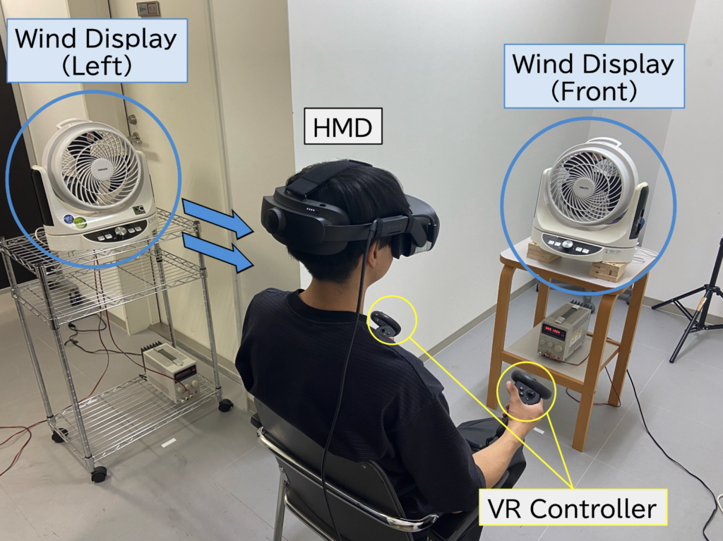風提示装置を用い,VR映像と風の組み合わせが「本当にその場にいる感覚」にどのように影響するかを研究しています。人への風の与え方を工夫することで,没入感を高め,次世代のVR体験を目指しています。