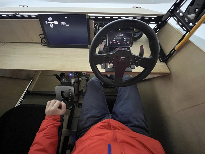 FANATECのステアリングコントローラを取り付けています.パワフルなコントローラーなので,机に固定する治具は自分で溶接して自作しました.